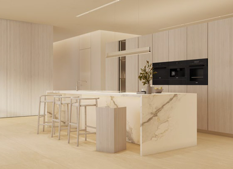 Die Innenräume sind bis ins kleinste Detail durchdacht und vereinen moderne Ästhetik mit edlen Materialien. Hochwertige Designerküchen, exklusive Markengeräte, elegante Natursteinoberflächen sowie luxuriöse Badezimmer mit Spa-Charakter machen jede Residenz zu einem Rückzugsort auf höchstem Niveau.