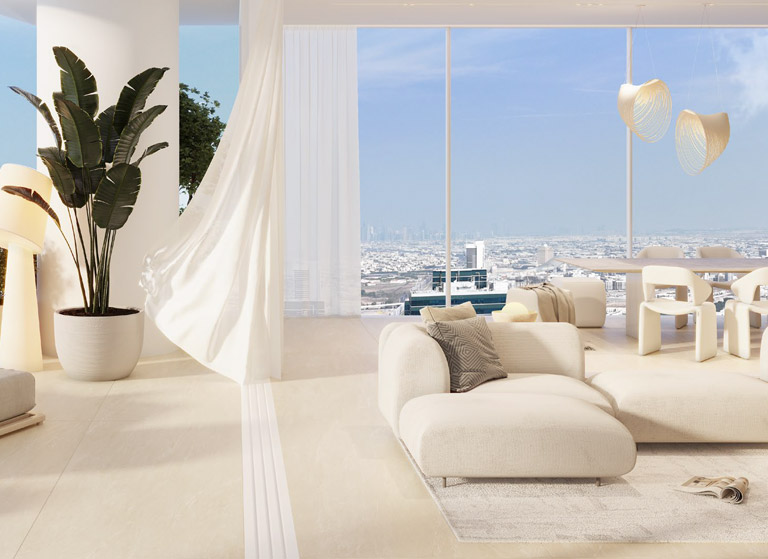 Die exklusiven Residenzen reichen von großzügigen 2- und 3-Schlafzimmer-Apartments über weitläufige Horizon Villa Apartments, luxuriöse Signature Duplex Apartments bis hin zu einzigartigen Sky Mansions und der ikonischen Pinnacle Mansion (Penthouse) – einer dreigeschossigen Residenz der Superlative. Großzügige Grundrisse, private Aufzüge, weitläufige Sky-Gärten sowie Deckenhöhen von bis zu 3,2 Metern schaffen ein außergewöhnliches Raumgefühl und maximale Privatsphäre.