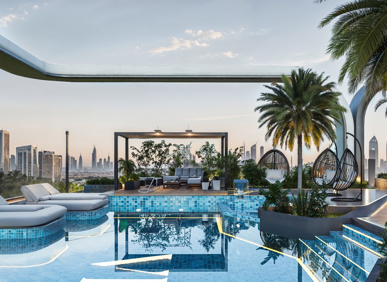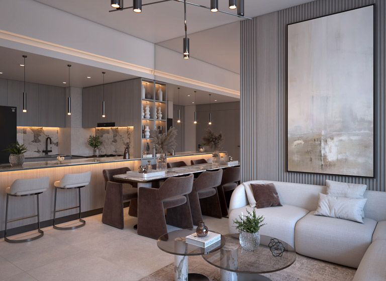 – 22 % größere Apartments als der Durchschnitt in Dubai – mit 3,2 m hohen Decken und bodentiefen Fenstern für maximales Licht und 180°-Panoramen.
